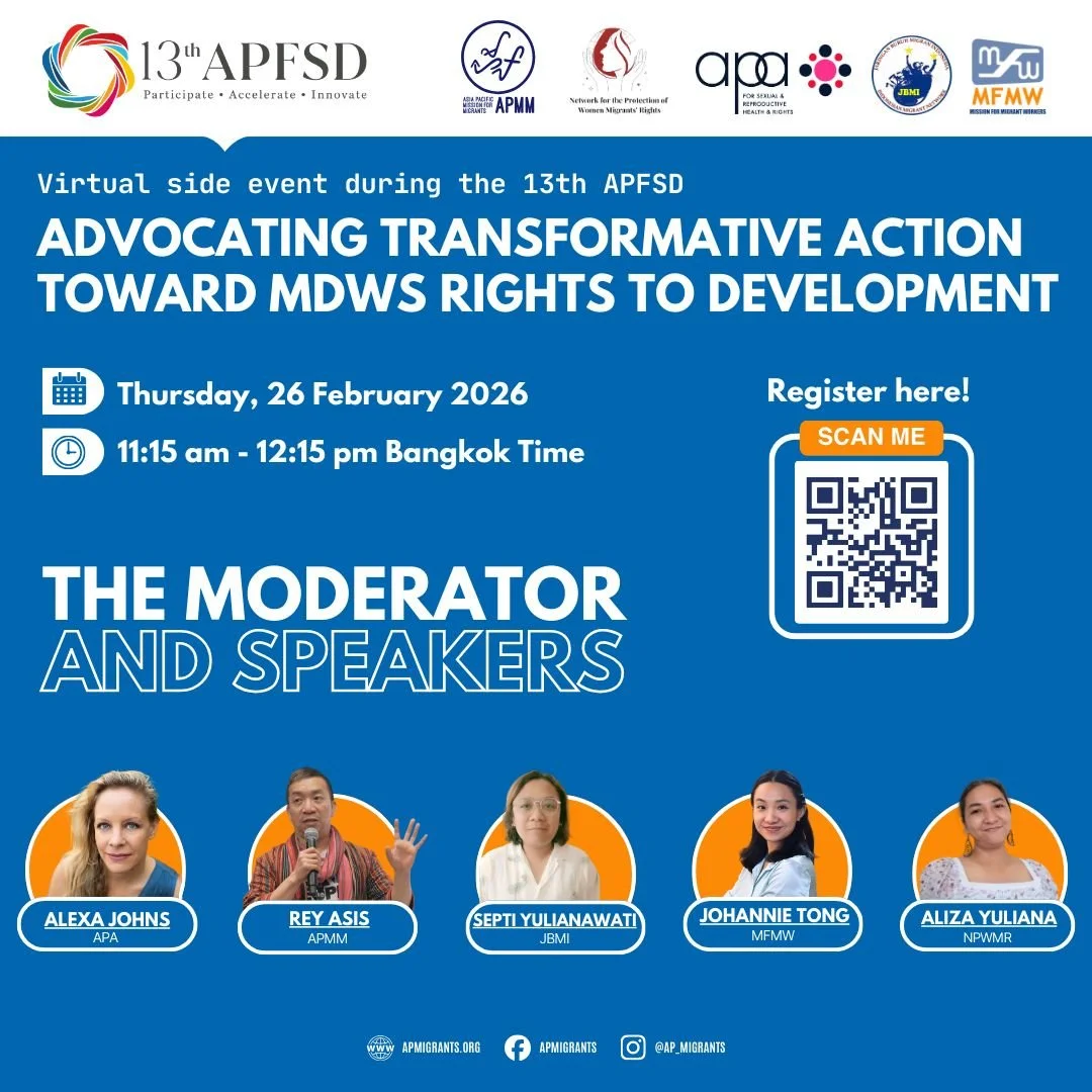 On February 26, Asia Pacific Mission for Migrants, together with the Network for the Protection of Women Migrants Rights (NPWMR), Asia Pacific Alliance for Sexual and Reproductive Health and Rights (APA), Jaringan Buruh Migran Indonesia (JBMI), and Mission for Migrant Workers (MFMW), held a virtual side event at the 13th Asia Pacific Forum on Sustainable Development. Entitled, “Advocating Transformative Action Toward Migrant Domestic Workers (MDWs) Right to Development,” the event examined systemic barriers preventing migrant domestic workers (MDWs) from fully realizing their development rights.